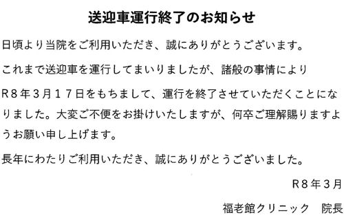 日頃より当院をご利用いただき、誠にありがとうございます。これまで送迎車を運行してまいりましたが、諸般の事情によりR8年3月17日(火)をもちまして、運行を終了させていただくことになりました。大変ご不便をお掛けいたしますが、何卒ご理解賜りますようお願い申し上げます。長年にわたりご利用いただきありがとうございました。